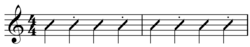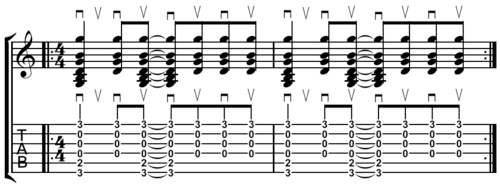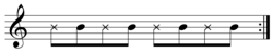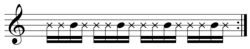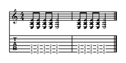 Guitar strum Playⓘ: pattern created by subtracting the second and fifth (of eight) eighth notes from a pattern of straight eighth notes.